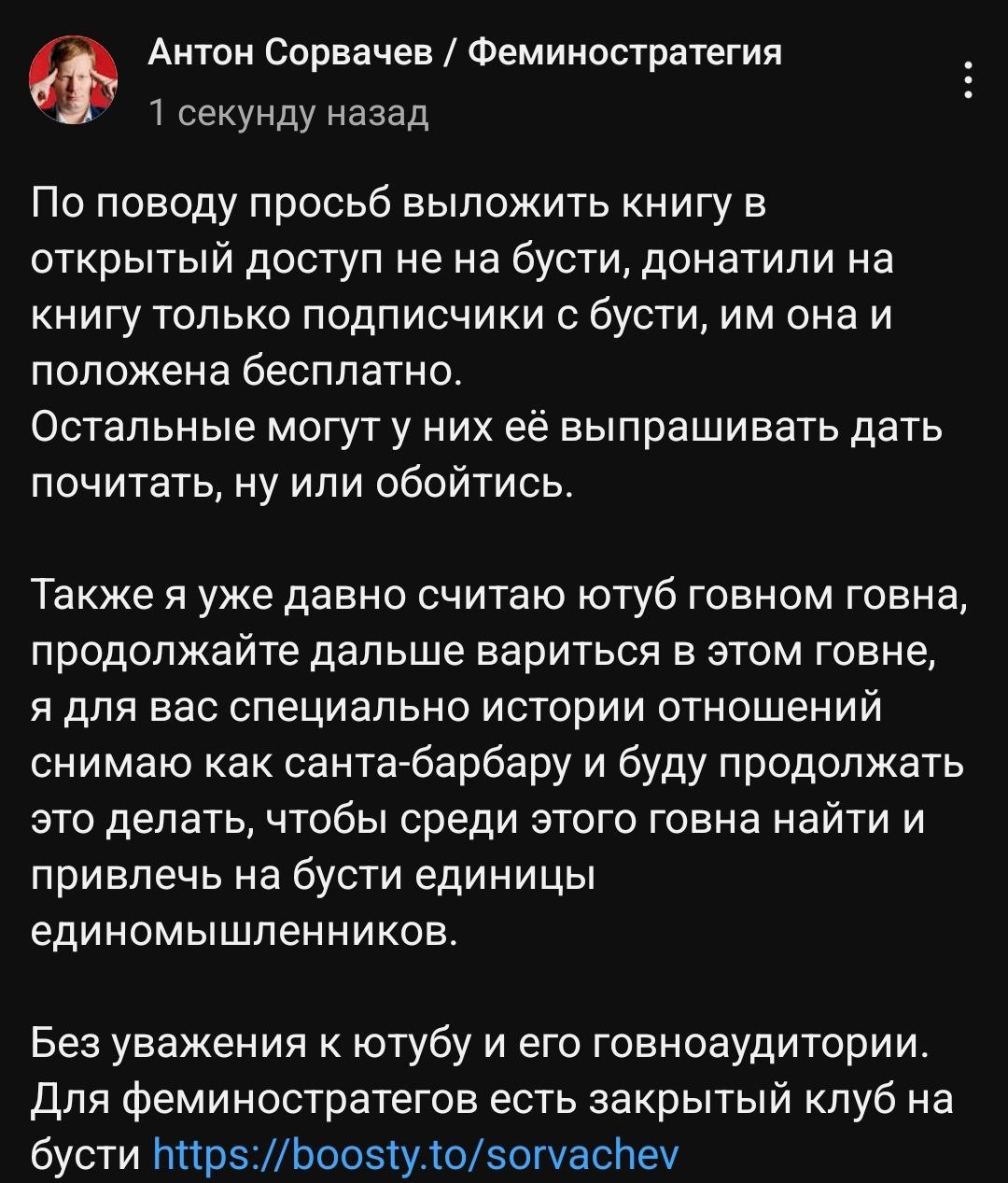 ОП, добавь Ямайского, он пока единственный на фоне этих всех кто действительно пилит нормальный контент, преподносит так как его и надо преподносить с иронией, угаром и сарказмом, при этом сам околочед(с десяток баб сказали, что он даже весьма и весьма привлекательный), а не ебливый обоссаный колхозник которым и при радикальном патриархате с бабами фартить не будет