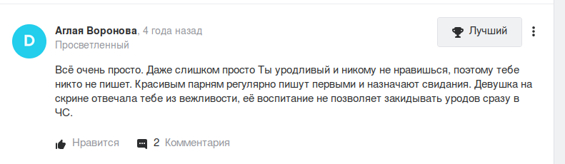 >Если бы в моё время было столько инфы, то как минимум кучу времени сэкономил бы. Причем тут это вообще? Ну, а ещё земля круглая и космос тёмный, полезные для мд факты? Иди нахуй кароче.