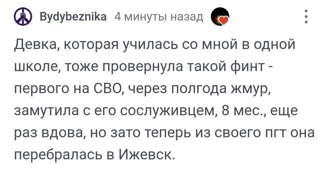 >3. Развелась целая куча так называемых СВОшниц, которые спецом ищут заключивших контракт и садятся им на шею. Тут схема простая. Пока тело воюет на СВО, селёдка жирует на его бабки, живёт в его квартире и вообще ни в чём не нуждается. Если очень повезёт, то в случае трупа получит ещё и выплаты плюс наследство (если алень очень махровый и впишет бабу куда-нибудь). К тому же схема беспроигрышная, никто не мешает бабе параллельно окучивать ещё несколько десятков таких же долбоёбов. >Но справедливости ради, схема работает и в обратном направлении. Достаточно сделать вид, что заключил контракт и отбоя от мясных дырок не будет. Будут давать без оглядки. Главное потом вовремя свалить в закат, желательно в другой город, если мухосрань.
