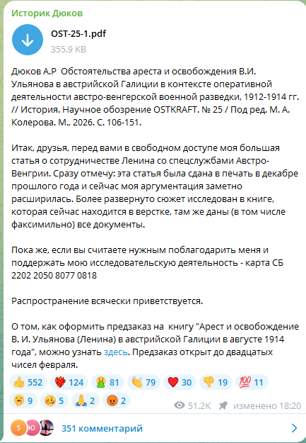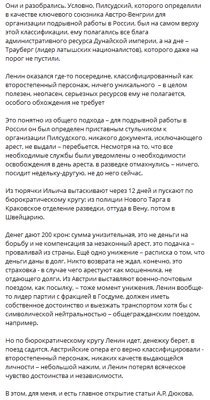 "В современной Европе идёт процесс создания огромного государства, возможно – центра мира. Не смотря на все предосторожности, гипермаскировку, колоссальный подкуп и т.д. это кровь и война. Ничего другого нет и быть не может. Европа вступила в эпоху наполеоновских войн. Путин день и ночь работает по Украине, подтаскивает её на квадратных колёсах в ЕС. Это фактический президент Украины и это приоритетное направление его деятельности. "Директор украинского проекта, по совместительству занимающий пост президента РФ" – вот должность английского генерал-резидента в современный период".