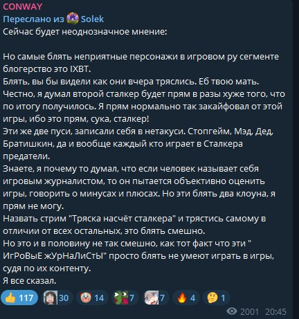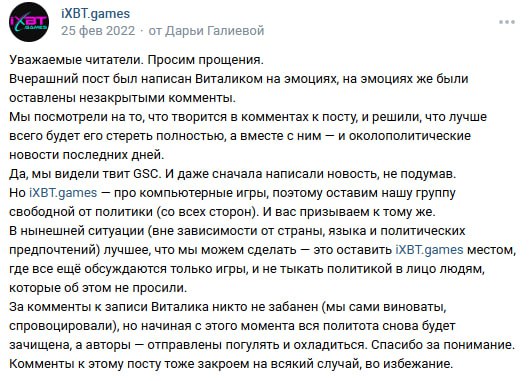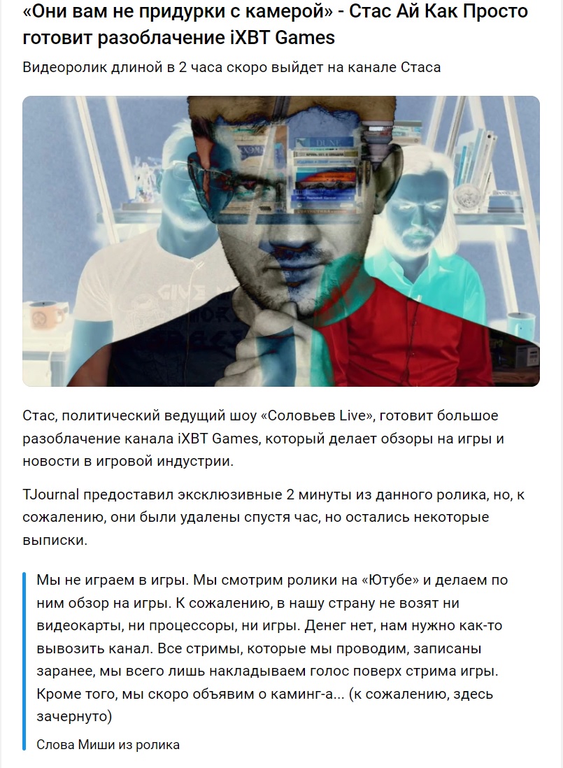 Надеюсь это действительно последний пост по этому срачу...... Бля, я не знаю уже сколько раз повторять. Те, кто говорят, про "не проверили инсайды", такой к вам вопрос. А вы сами вообще знаете как работает журналистика и откуда появляются "инсайды". Бля да даже миша подробно разжевал это в последнем видосе. Обьясняю тебе наглядно. Инсайд это когда нынешний/бывший/приближенный разработчик пишет человеку и сливает информацию. Очевидно, зачастую без существенных пруфов, а иногда если получается с пруфами. И никто, очевидно, не показывает свои имена, паспортные данные и ничего, что поможет идентифицировать человека. И зачастую эти люди ко всему прочему просят об анонимности, ибо за сливы могут получить проблемы. Просто тут очевидное лицемерие, почему-то к "инсайдерам", которые "сливали" инфу и даты релиза ХЛЗ, то им ничего не было за пиздеж. Да и вообщем дахуя случаев, когда реальные журналисты постоянно обсирались на инсайдах, потому что блять это норма) Инсайды есть везде, и будут. И не всегда они подтверждаются. Зайди в любое комьюнити, всегда найдется так или иначе инсайдер, который будет сливать какую-то инфу. А про Виталика могу лишь сказать, что от этого конфликта доверие к ним не пропадает, ибо как пруф он показал в видосе один из баннеров отмененной игры от Zenimax, которого ВООБЩЕ нигде не было и нету