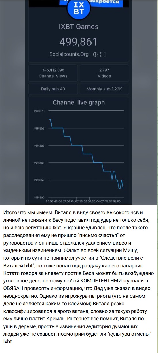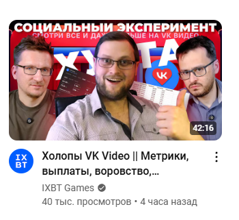 Давайте поиграем в Ваенгу. Учитывая, что на ютуб продолжают заходить, скажем так, не самые добросовестные люди, раскукоживающие ютуб, - все добросовестные в ВК и Рутубе, - которые симпатизируют в основном соевикам и релокантам, а не нашим базовичкам, то думаю, что на Ютубе эта часть аудитории у Иксбт может отвалиться. И на ближайшие видосы просмотров на хайпе еще будет нормально, но потом хайп скиснет и просмотры упадут. А ютуб приносит больше донатов, интеграций и прочего, чем Рутуб и ВК, следовательно доходы у наших слонов, увы, могут просесть. А вы что думаете?