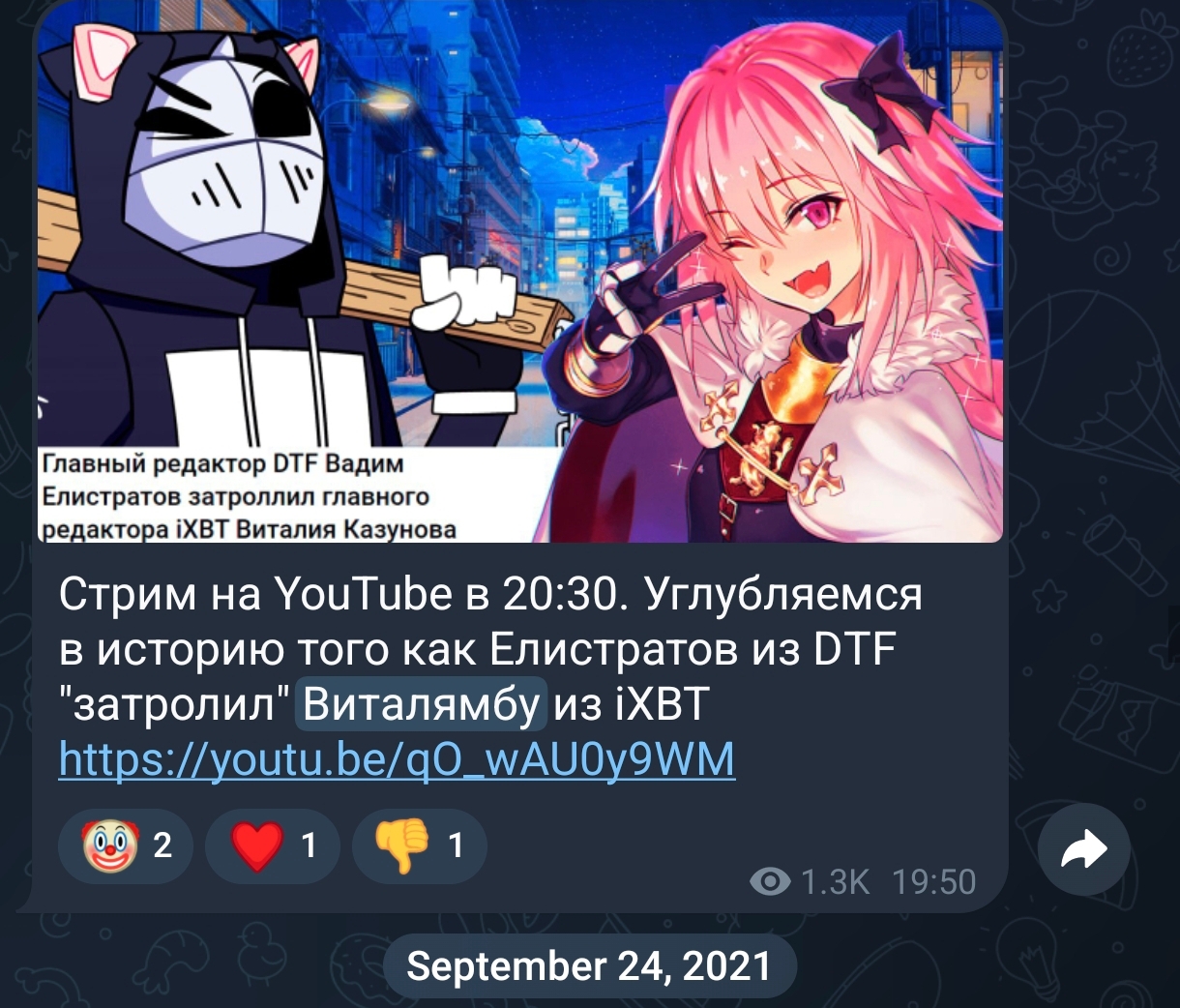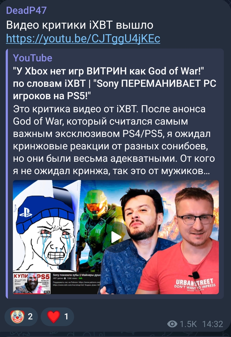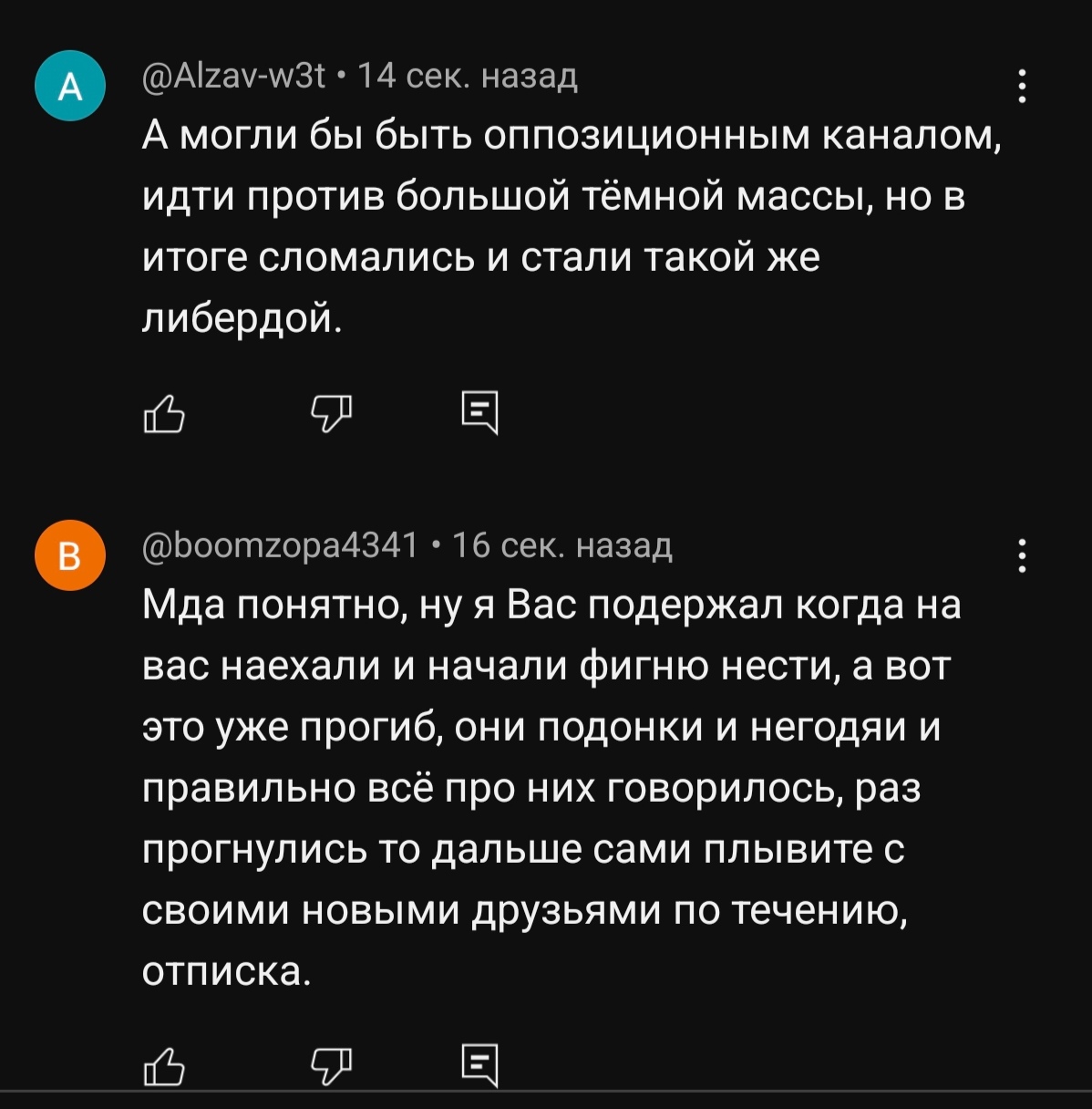 >>1047654 Чувак, у них там буквально война сейчас. У всех накипело от этих белорусов, посмотри сколько оф каналов только под роликом деда отписалась, а сколько в своих телега и прочем - дохуя. За ixbt публичных личностей нихуя, но вот подпивасов зетнков не мало. Виталя начал копротивляться и за это дед и ко решили его топить, поэтому всё резко и публикуется, и это поощряется синими галочками. Никто не охуел от этого, реакция противоположная. Считаю что в ближайшее время либо всё резко остановится (тут мировая какая-то будет, условий мы не узнаем), либо дед сольет ещё всего, тк сейчас ему льют дохера переписочек.