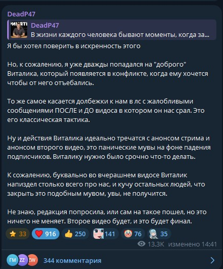 Единственное, что Виталик из этой истории положительное получил - это донаты на стриме и комменты от ядерной подпивасной ЦА "молодец мужык признал ошибку".