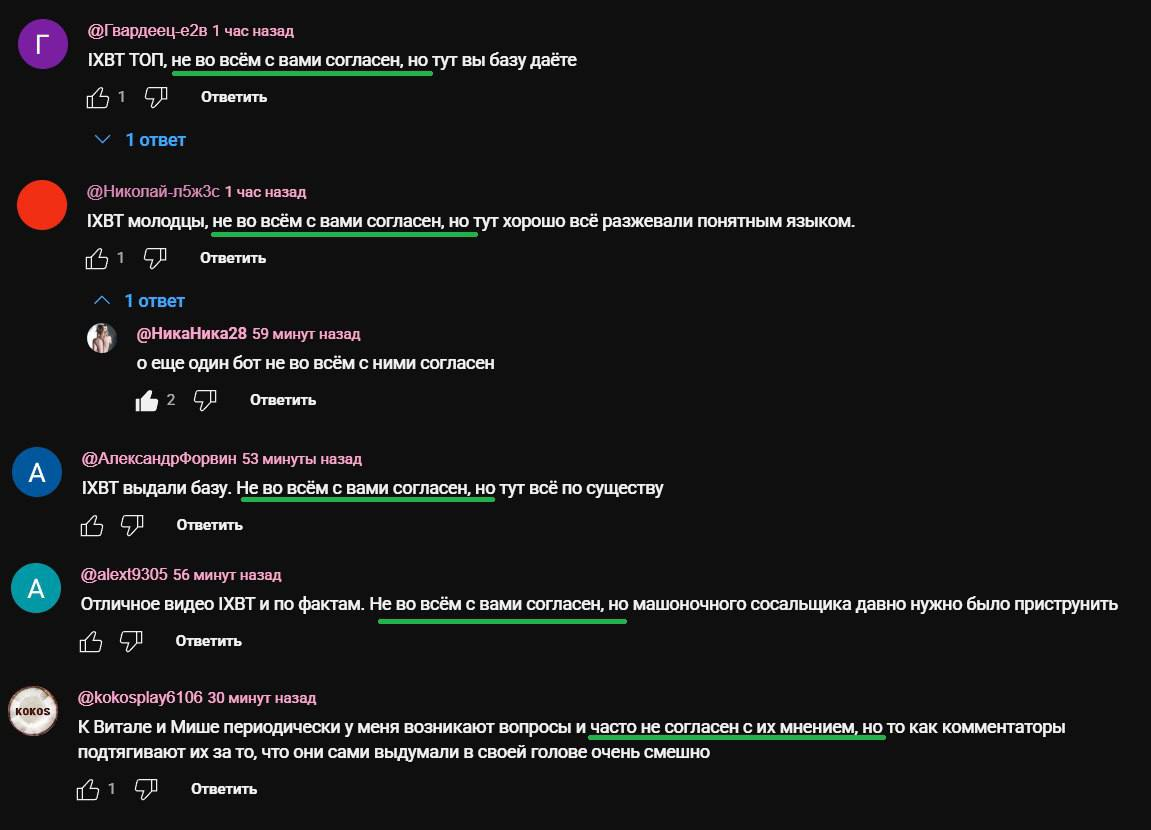 >>1047672 >посмотри сколько оф каналов только под роликом деда отписалась, а сколько в своих телега и прочем - дохуя. Ты вот про вот этих >>1047614 У большинства этих оф каналов действительно общий паттерн одной тусовочки. Словно все в одной конторе сидят и им поручение прилетело гасить. >За ixbt публичных личностей нихуя Тоже хватает. Но это неправильные личности, поэтому выписываем их в подпивасов зетников.
