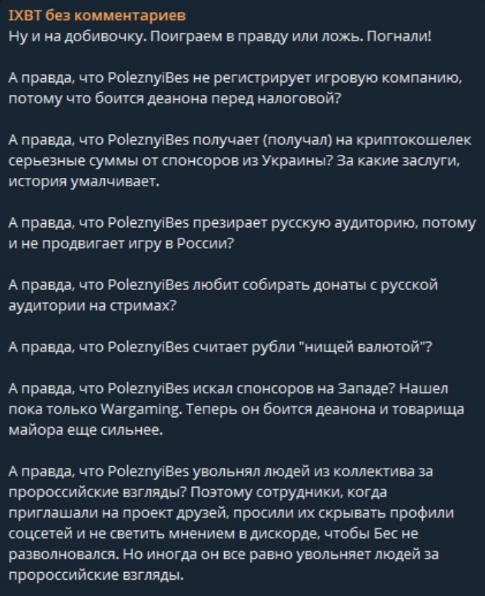 И уже другие вопросики возникают - а уж так ли Виталямбус был не прав? Его может и занесло и не туда, но по фактам-то бес и казиныч47 из рашки съебнули и кроют ее хуями, ясен хуй не забесплатно, а кто будет на такой контент донатить? Известно кто.