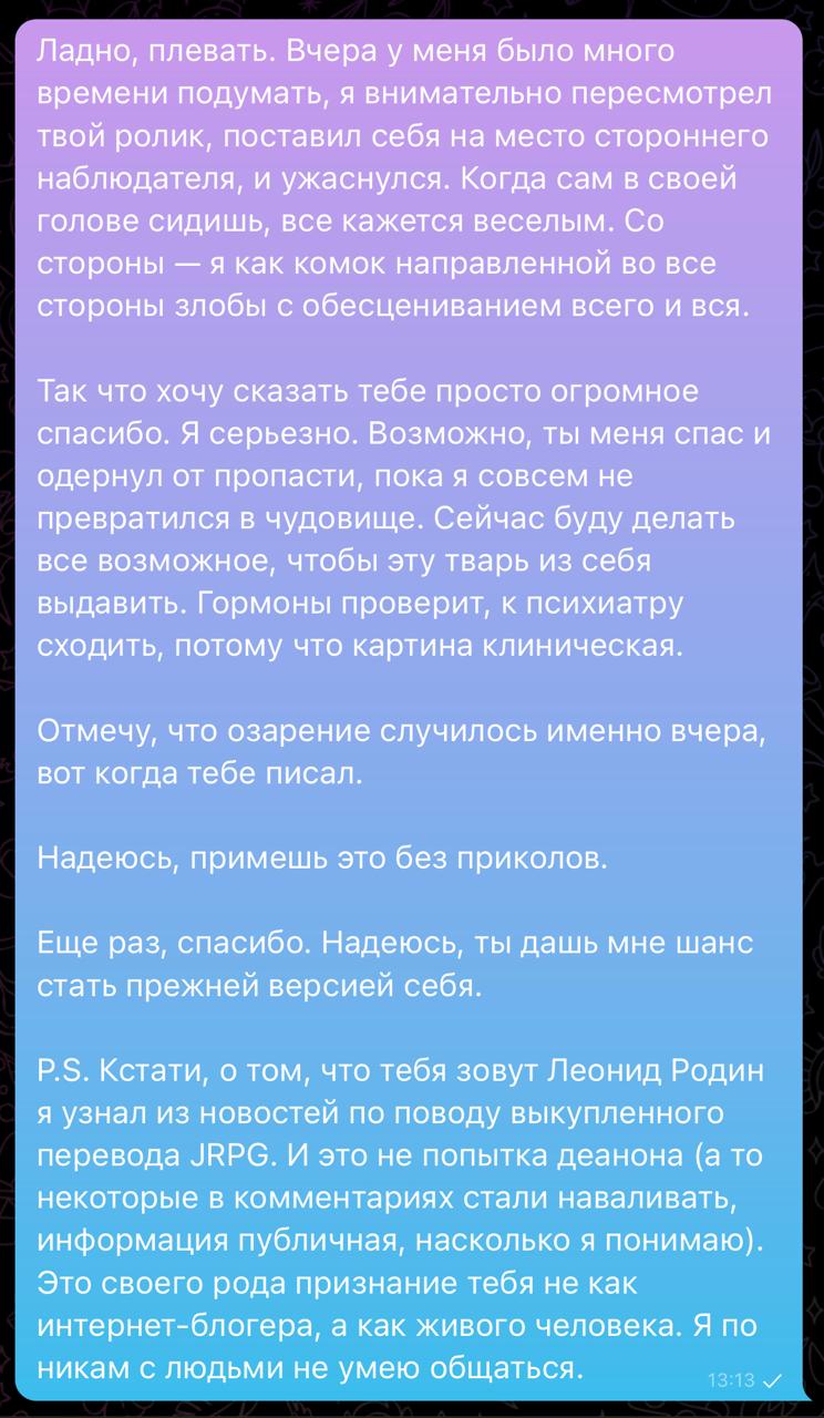 Но не суть, в таких конфликтах главное, если реально по делу предъявляют - признать косяк, и тогда ты тупо чужой козырь превращаешь в свой. А если игнорить или пиздеть - то этот зашквар навсегда прилипнет. Но это, конечно, если человек за репутацию переживает, а не какой-нибудь говномаз которому чем хуже тем лучше.