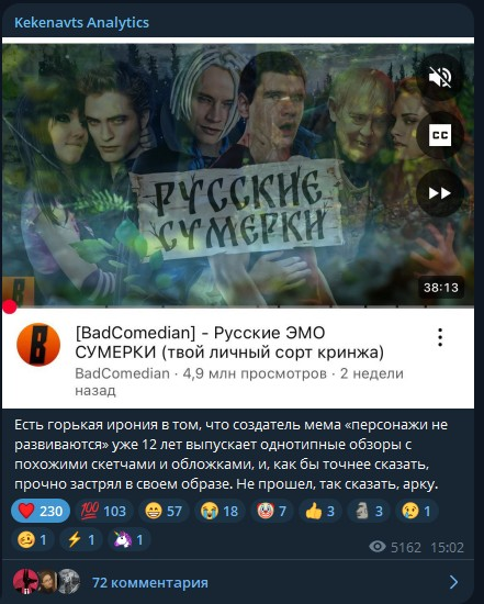 Терл норм обзорщик (особенно позднее, меньше стало пердильных щщюточек), если бы он не пытался в СКЕТЧИ. То, что они хуесосили у Баженова (на эфире с чмаргиналом), оказалось его самым слабым местом. Сначала стоически смотрел эти потуги актёров погорелого театра, думал, ну может, какой-нибудь прикол ввинтит в сюжет обзор, но потом стал тупо скипать. Что характерно, у Баженова эти скетчи ещё более-менее смотрибельные, а вот у гигантов ютуба, как Ностальгирующий критик, это просто несмотрибельно, сразу проскипываешь на обзор. Ещё Better Voice этим грешил в начале, сейчас понял осознал, и этого мусора стало меньше.