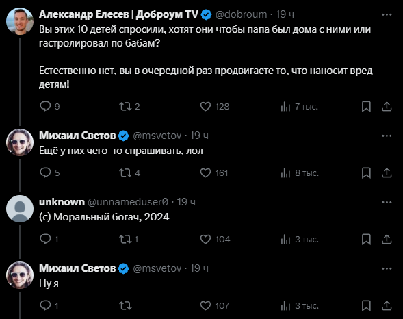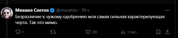 В твиттере вышел на новый уровень провокаций. Хвалит Лебедева и завидует его стилю жизни. Зачем он это написал? Можно с таким же успехом восхищаться личной жизнью Адольфа Гитлера. Понимает это все Михаил, хочет общения, внимания и копро, у Саши запор.