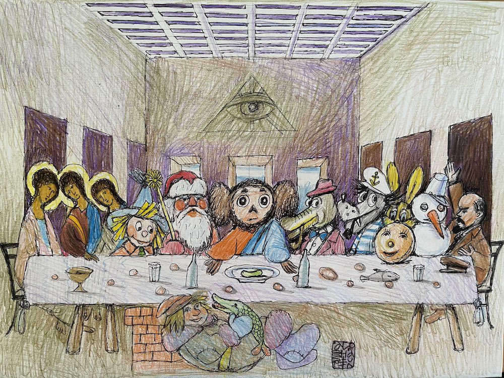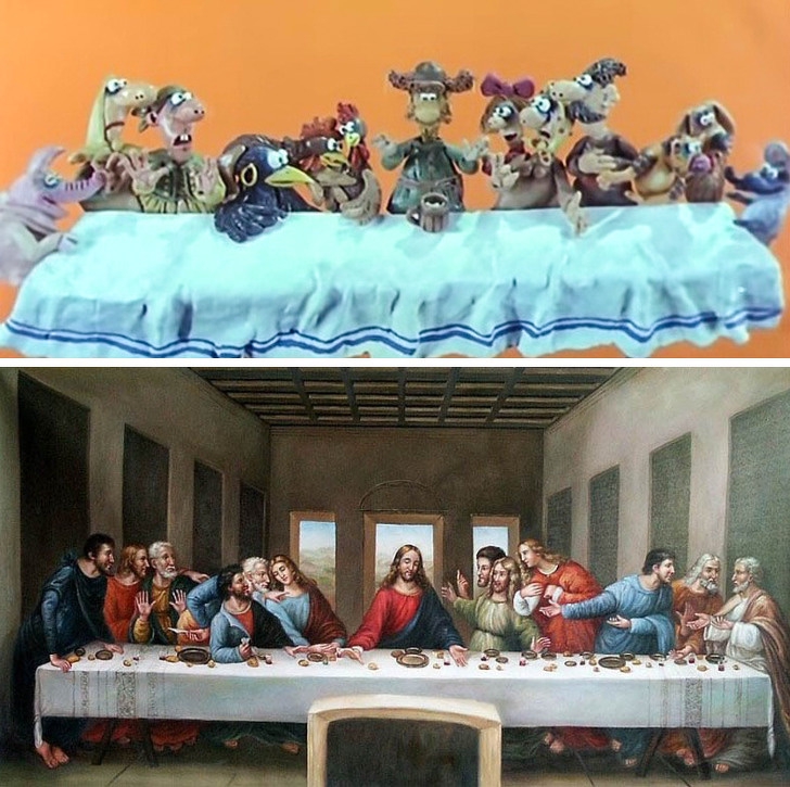 на тайную вечерю столько уже было пародий и шаржей - штамп штампованный... сколько можно с этим баяном носиться?) тем более глубинный народ хуй ложил на всю эту духовность и прочие соборы парижской... богоматери