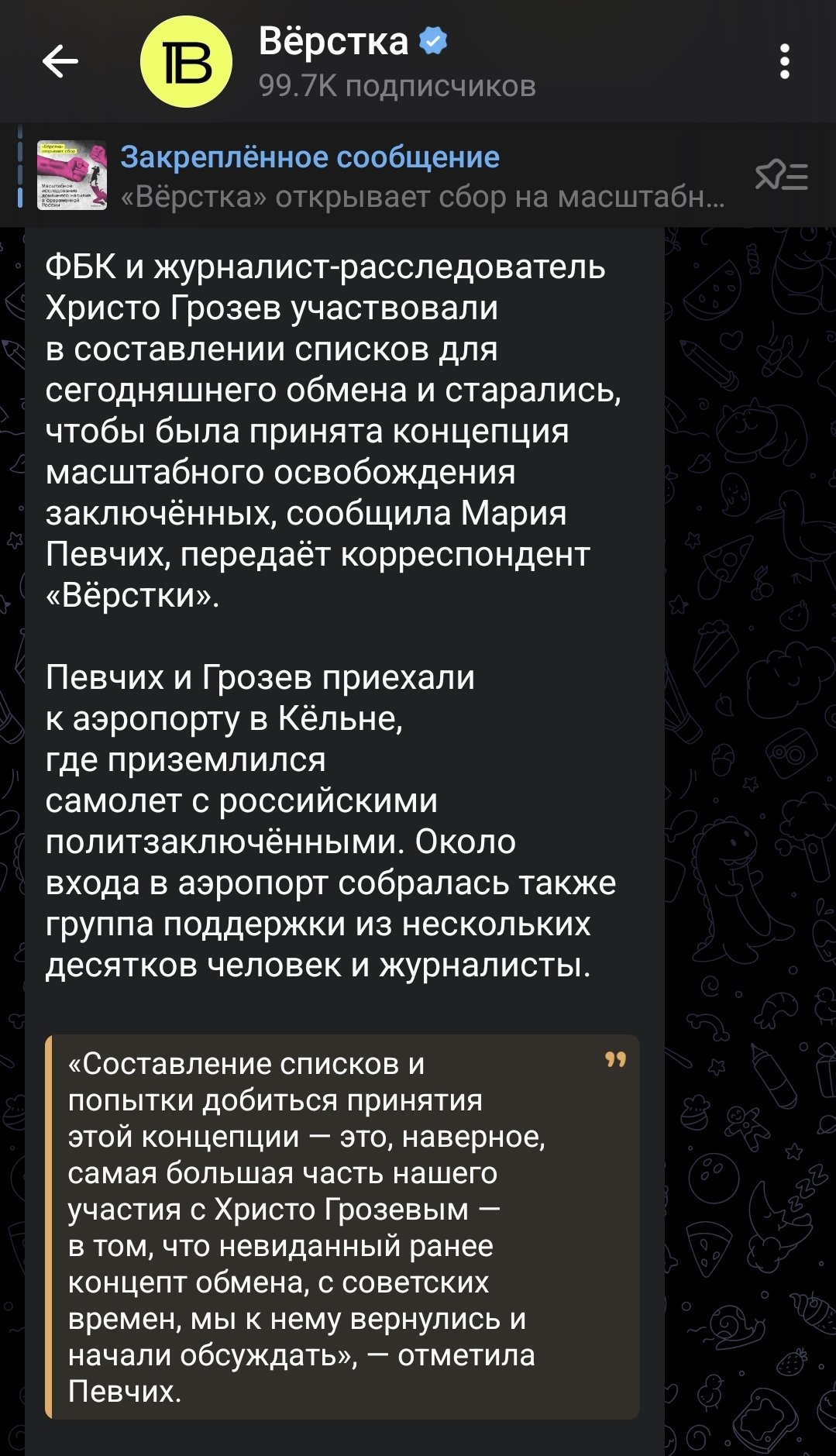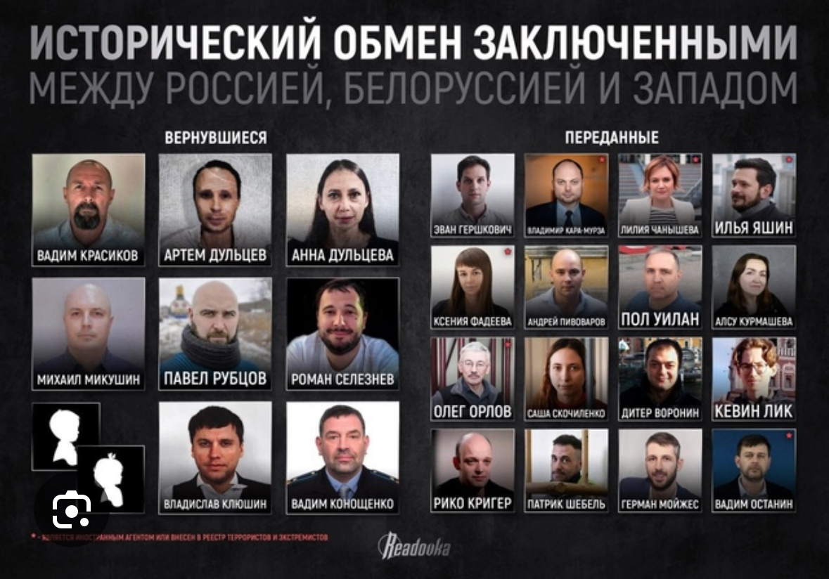 >>927425 По данным СМИ, власти России выдали Владимира Кара-Мурзу, Илью Яшина, Олега Орлова, Андрея Пивоварова, Сашу Скочиленко, Лилию Чанышеву, Ксению Фадееву, Вадима Останина, Кевина Лика, Демури Воронина, Германа Мойжеса, граждан США Пола Уилана, Эвана Гершковича, Алсу Курмашеву, гражданина Германии Патрика Шебеля