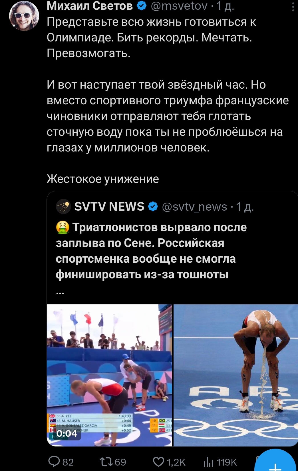 >>924956 (OP) Зашел почтать эсвити нюз, 10 новостей подряд об олимпиаде, как там все хуево, как религию оскорбляют и пускают слезы по высылке шлюх из ТАСС, в комментах ставят клоунов всем, кто называет их пропагандистами. Неплохо, неплохо. Ни в одном ватном паблике параллельно нет ничего подобного. Совсем ебнулся наш мальчик.