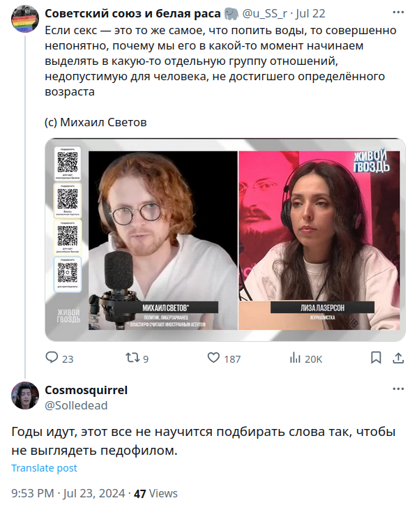 >>929353 на какую аудиторию вещает светов хер поймёшь - в народе он известен только как предатель родины и педофил... то есть глубинному народу он нах не нужон