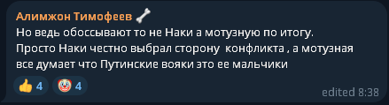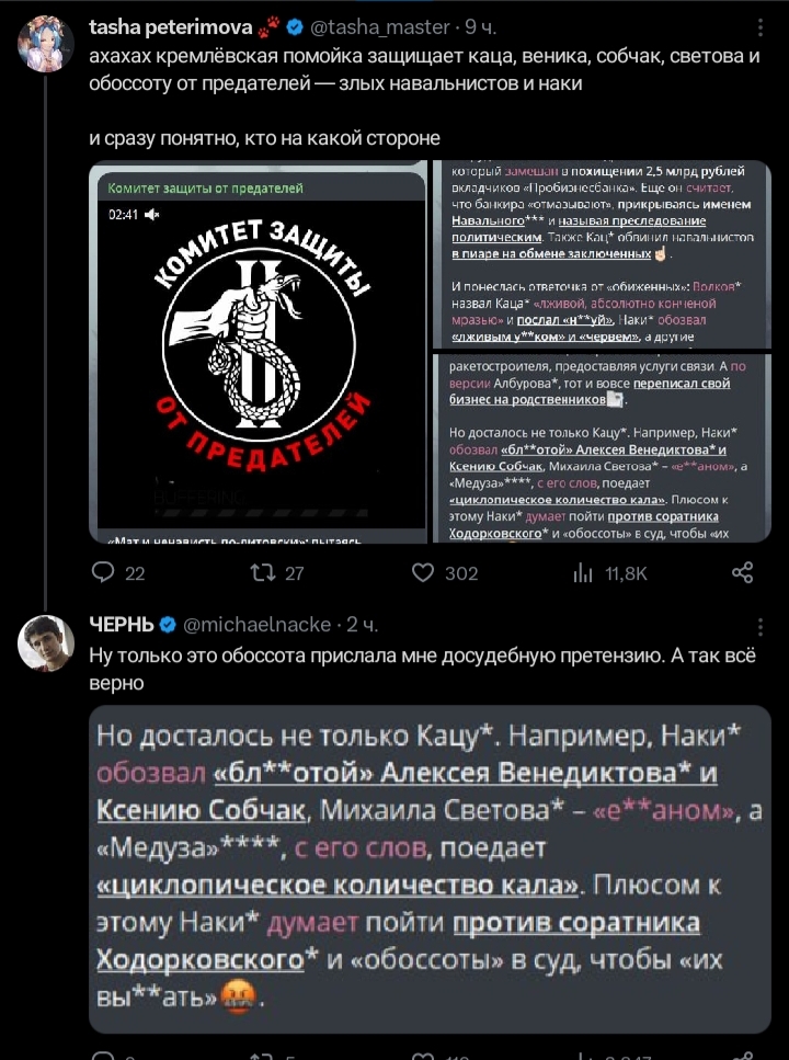 >>929345 Если ты про Каца и Наки, то у них противоположные позиции. Первый ближе к Светову, жалеет мальчиков в трусиках, рассказывает, что мобикам не оставили выбора. Второй говорит, что если между штрафов 5000 рублей и мобкой выбрал мобку, то значит военный преступник, а не жертва.