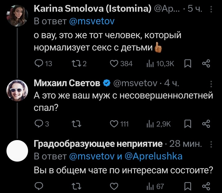 Несколько дней назад одна из телеграм-блогерок изучила страницу девушки, с которой был замечен нижегородский женоненавистник Алексей Поднебесный, и приложила к своему расследованию скриншоты расшифровки голосовых сообщений. В них, как утверждается, 15-летняя девочка рассказывает, что она занималась сексом с Поднебесным, потому что ей «не жалко»: «И помню то, что мы с друзьями, мы дико с него угорали. Мы угорали с его истерик, угорали с его философских идей, с того бреда, что он несет. <...> И, короче, я говорила то, что я ему дам просто по рофлу, ну, вот реально по рофлу, потому что мне не жалко. В итоге так и получилось».