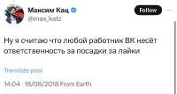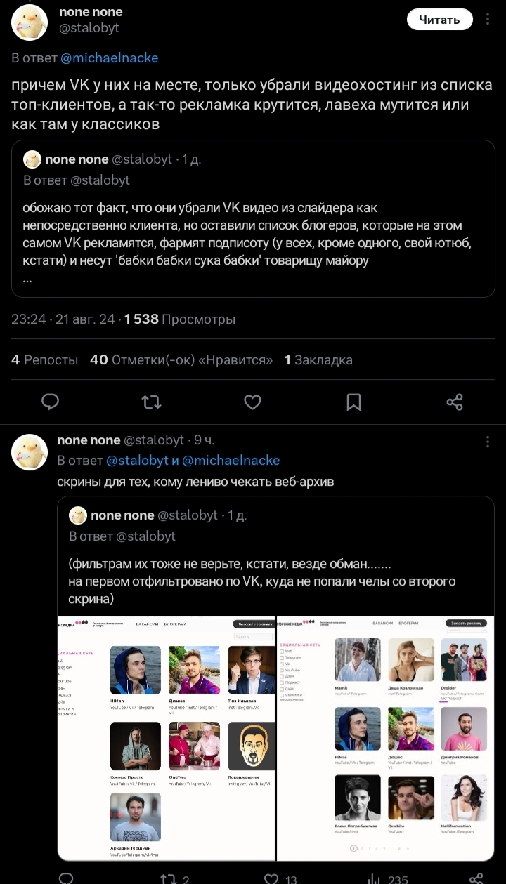 >жена каца оппозиционера держит бизнес в рф и сотрудничает со всякими сберами и вк >неделями этим долбят каца, т.к сам кац выступал против той же апшной вкшечки >19 августа с сайта выпиливается упоминание вк видео, но список блогеров, которых продвигает медиа каца и которые рекламируют сервисы вк, остается >светка раздупляется позже и пишет правду про бизнес жены каца, но т.к лого вк видео выпилено из спонсоров на сайте и не сохранено в вебархиве, дает заднюю, хотя все тоже самое пруфается списком этих самых видеоблогеров