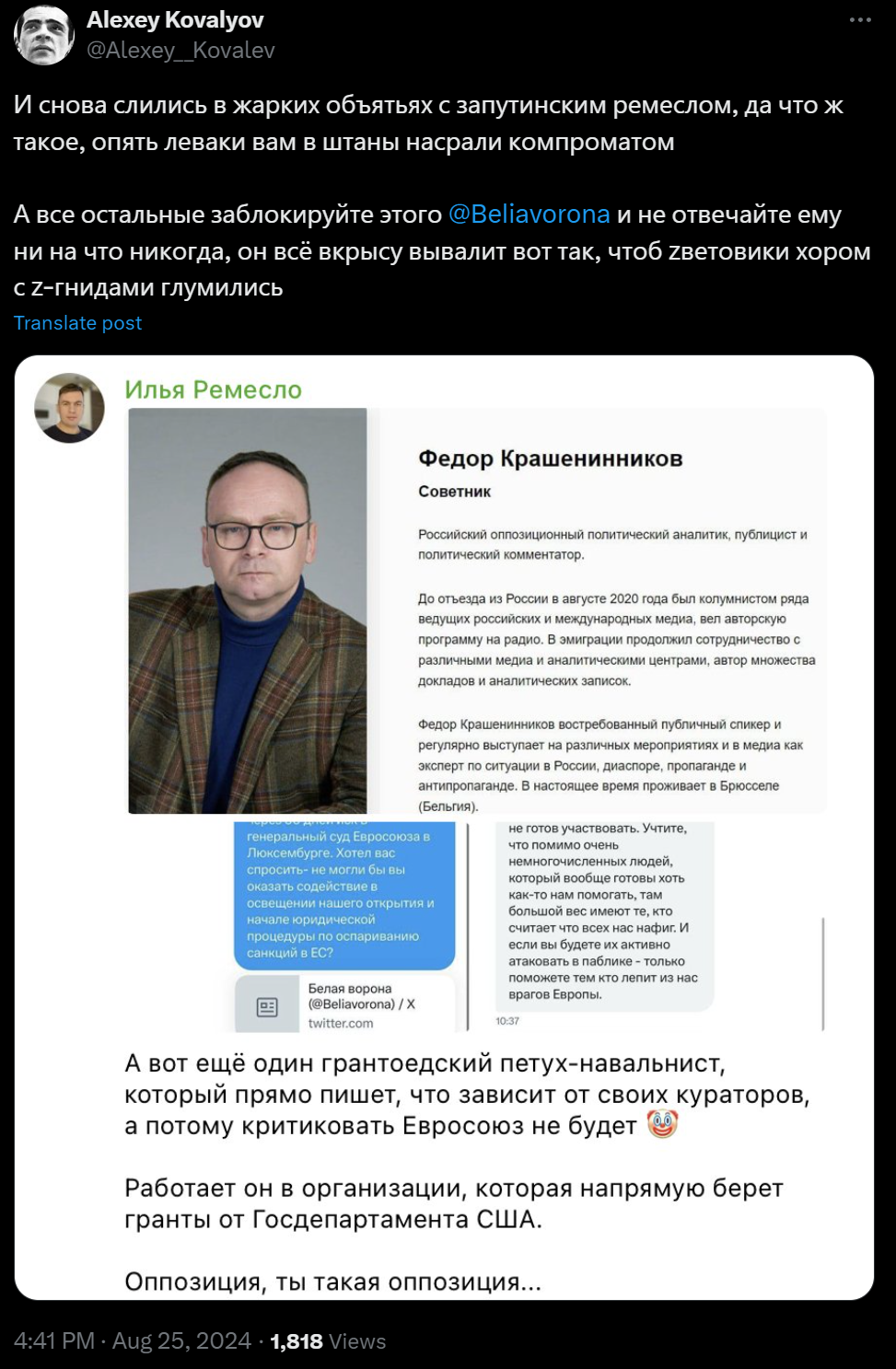 Она с основания ФБК у Навального светилась уже, пиздаболина. Неудивительно что по ртшным методичкам жопу кацу прикрываешь. Не забудь нахрюкнуть, что Навальный в Йеле учился и дочку в Стэнфорд устроил, ведь это тоже 99.9% пидорахам недоступно, а значит плохо. А вот подфсбшные конторы пиарить в разгар войны и чебурнета – ничего такого. Так и запишем.