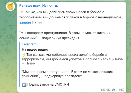https://youtu.be/IG6pEW9PwTk?si=vIvwF752OKWtTTVY В этом почти двухчасовом видео мы собрали позиции и высказывания об СВО большей части так называемой «левой общественности» в России. Конечно, список не исчерпывающий: в него не вошли десятки небольших левацких пабликов, и, наверное, ещё с десяток более-менее видных медийных деятелей, как та же Виктория Гарсия Берналь, но всё-таки, на текущий момент это единственное видео такого формата, что нам попадалось в «левой блогосфере». Запасайтесь попкорном, успокоительным и приятного вам просмотра!
