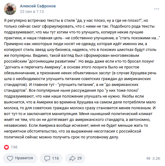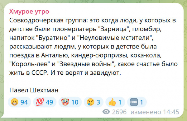 А, по-моему, всё ровным образом наоборот. Это мне, у которого в детстве были пионерлагерь, "Буратино" и "Неуловимые мстители", люди, у которых в детстве была Анталья, киндер-сюрпризы, кока-кола и "Звездные войны", рассказывают сказки о том, какой прекрасный был Советский Союз. Я много раз это наблюдал. Как начинают рассказывать какие-то сказки про советский концлагерь, так сразу заглядываешь в профиль - а там минимум восьмидесятые-девяностые года рождения. И если вдруг среди них попадается кто-нибудь из шестидесятых-семидесятых, то это дочки-сынки каких-нибудь шибко партейных руководителей, семьи которых, конечно, жили совершенно по-другому - не так, как мы, очень недорогие советские граждане. И это, заметьте, я еще - москвич и из вполне благополучной семьи. Но я хорошо помню, что собой представлял этот очень лицемерный, опутанный по границам колючей проволокой и конкретно нищий (потому что Госплан и гонка вооружений) Совок.