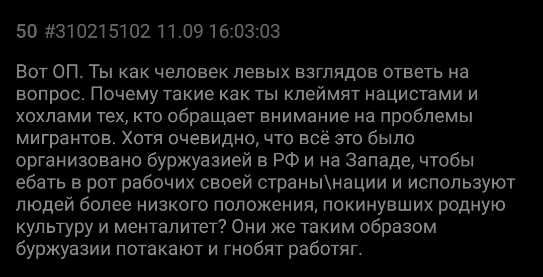 А почему вы говорите что в русском пространстве есть какие то левые, если разобрать дела и тейки это выйдет смесь консервативного евангелиста из США(правый) смешанного с шизом конспирологом из МАГ(ультраправый) с уровнем пещерного шовинизма типичного нациста(ну правее уже невозможно). Западный ультраправый на фоне российского левака умеренный соевый центрист. Да и русский нацист или монархист в плане идей и риторики по левее русского человека называющего себя левым. Может назовёте тред правильно «тред истомных ульраправых» Да и как так вышло то что русские левые это на деле ультраправые фашисты?