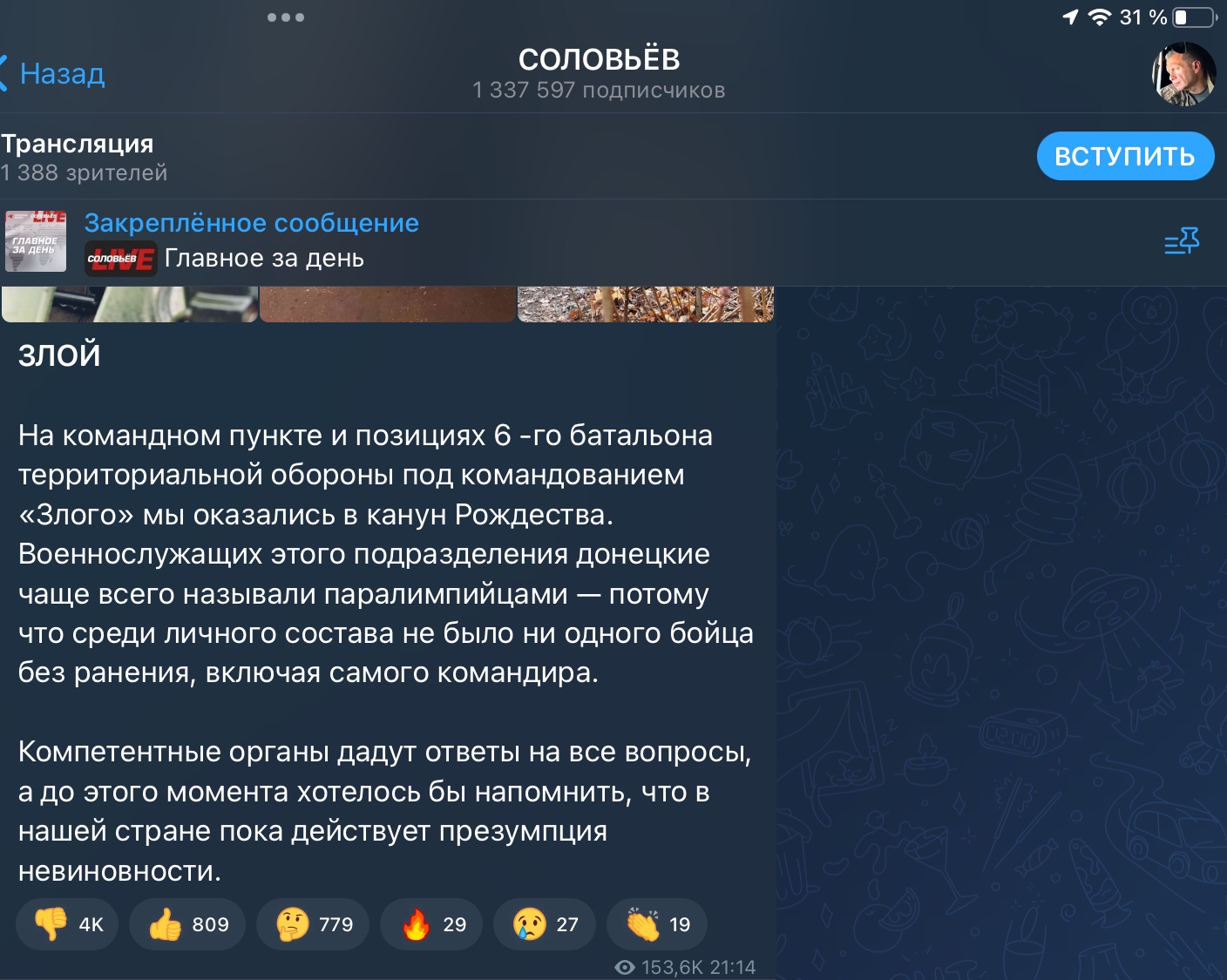 Пару дней назад вышло интервью Алаудинова Калашникову. Интервью интересное. Я впервые услышал (не из своих собственных уст, а из уст медийного и высокопоставленного человека) озвучивание проблемы, о которой я давно пишу. О блогерах, специально сеющих панику и объективно работающих на те же силы, что и ЦИПСО. И которых (блоггеров) покрывают серьёзные силы в руководстве РФ. "Службы", как выразился Алаудинов.