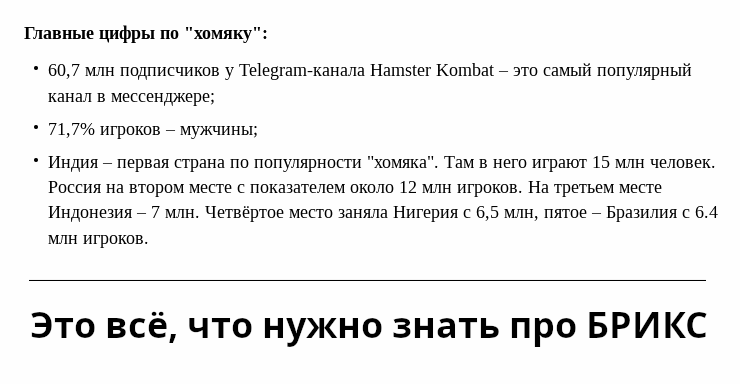Краткая сводка последних новостей: Товарищ Путин запретил буржуйский Youtube и правильно сделал! Товарищ Путин уверенно ведёт наступление во второй Курской битве с укробандерапиндосасиононеогиперфашистами! Товарищ Лукашенко выражает озабоченность скоплением укробандерапиндосасиононеогиперфашистов на границе Беларуси! Товарищ Ким Чен Ын доблестно борется за победу идей чучхе над силами природы! Товарищ Си Цзиньпин превращает тихий океан в океан мира и дружбы! Товарищ Мадуро снова одержал победу на выборах в Венесуэле! Левые силы свергли деспотию в Бангладеш! Левые силы отметили свою победу во Франции Олимпиадой! Левые силы отметили победу толерантности в Англии! Левые силы отметили победу толерантности в Германии! Левые силы отметили победу толерантности в Ирландии! Товарищ Харрис подставила плечо дружбы товарищу Байдену в предвыборной гонке в США. Боец антифа промахнулся по Трампу.