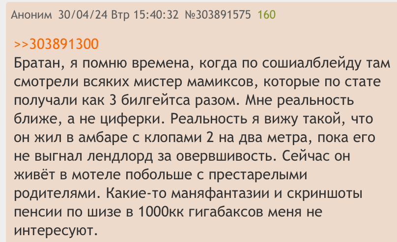Ну кстати не так часто он там сидит. Треды про узбека переодически создают, но подпедочурка с форсом жены и богатства прибегает где-то в 1 случаях и 5. В остальных аноны спокойно обсуждают и рофлят с нищего колбасного эмигранта инцела.