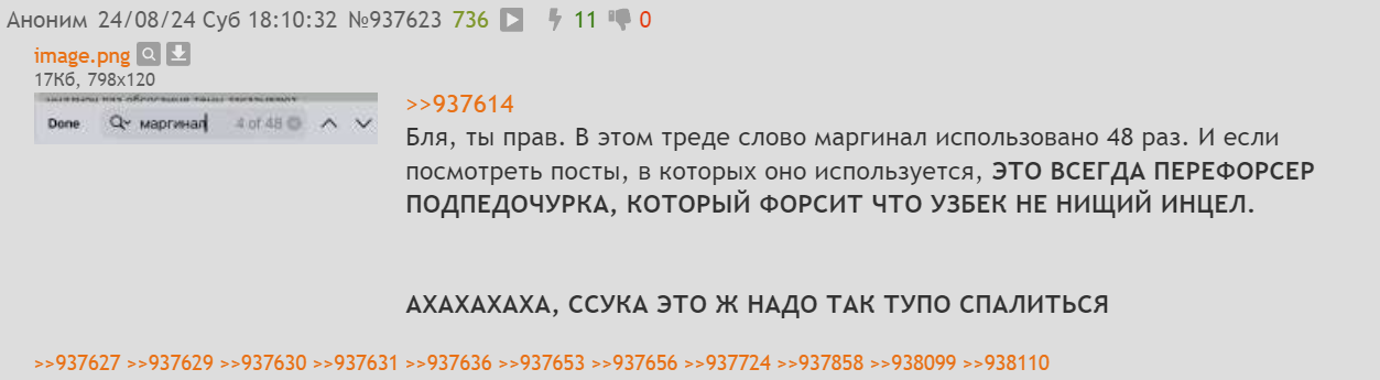К слову о срикере. Там каждый первый газонюх верит в форс узбека про жену, но вот существо с пика отличается тем, что прям плотный газонюх: платный подписчик, донатер, МОДЕРАТОР И ЗАНЮХИВАЕТ С 2017 ГОДА. Чурка бы не стал на форс назначать залетного, а тут олд, донатер еще и модератор. Возможно это и есть наша подпедочурка. Плюс он прямо говорит что где-то накручивает лайки ботом, то есть тоже в копилку нашей подпедочурки накрутчика. И постоянно называет педоузбека ЧМОМ. Если нажать ctrl f в этом треде и ввести "чмо", то все посты будут от подпедочурки форсящей хуйню про жену. Как и если сделать поиск по "маргинал". Слишком уж много совпадений