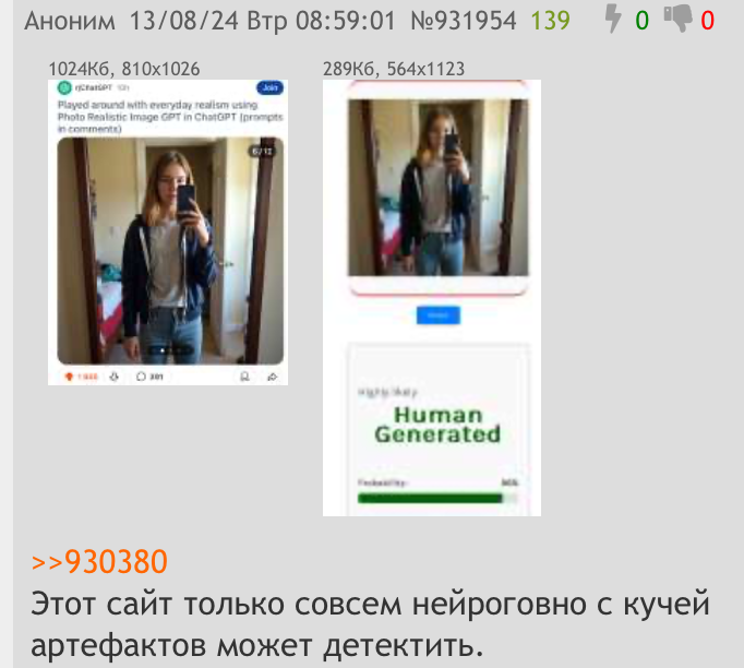 >>946709 Да этот говносайт уже миллиард раз обоссали в треде. Причем раньше он нормально работал и детектил все газонюшные перемоги как нейросеточные, но потом они изменили алгоритм и теперь он вообще нихуя не может распознать, этим и перемогает подпедочурка.
