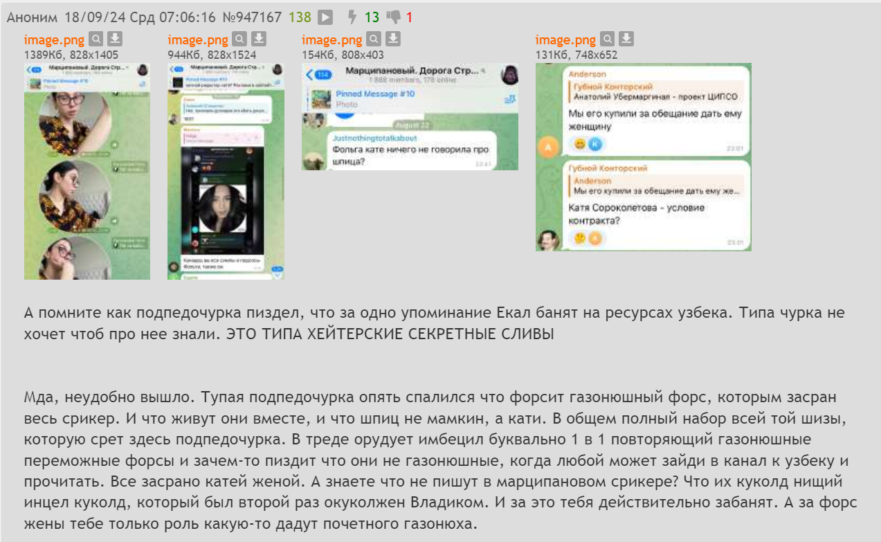 Мда, неудобно вышло. Тупая подпедочурка опять спалился что форсит газонюшный форс, которым засран весь срикер. И что живут они вместе, и что шпиц не мамкин, а кати. В общем полный набор всей той шизы, которую срет здесь подпедочурка. В треде орудует имбецил буквально 1 в 1 повторяющий газонюшные переможные форсы и зачем-то пиздит что они не газонюшные, когда любой может зайди в канал к узбеку и прочитать. Все засрано катей женой. А знаете что не пишут в марципановом срикере? Что их куколд нищий инцел куколд, который был второй раз окуколжен Владиком. И за это тебя действительно забанят. А за форс жены тебе только роль какую-то дадут почетного газонюха.