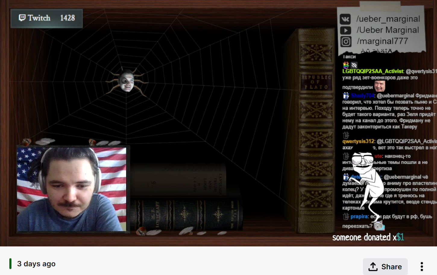 У чучмека вчера было 230 зрилов и он реально смотрел видосы по 1 очереди за 25 рублей, пока Жмиль минимум смотрит за 200р/минута и на каждом ауке выносит по 100к. Вангую, что он уже миллион раз пожелел что выбрал сторону хохлов. Щас бы и донаты были, и зрители, да и Кремль как выяснилось щедро заносит блогерам, но он выбрал сидеть нищим у мамке на шее, "ЗАТО Я ЗА ХОРОШИХ!"