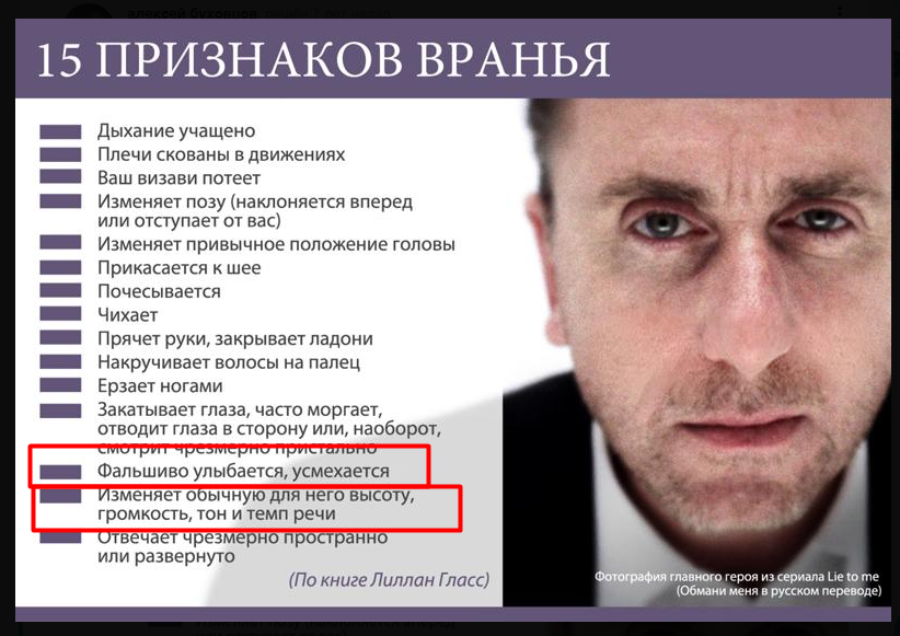 >>964809 >>964807 >Искренняя улыбка вызывает сокращение круговых мышц глаз, от которых появляются легкие морщинки в уголках. Одновременно с этим сокращаются мышцы над веками, брови слегка опускаются, щеки приподнимаются. Фальшивая улыбка выдает себя пассивностью круговых мышц глаза, в результате чего щеки почти не приподнимаются, отсутствуют характерные морщинки у внешних уголков глаз.