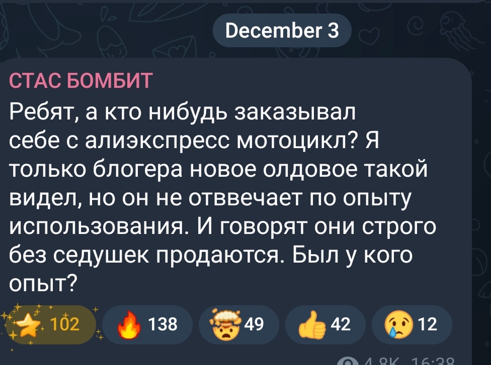 Но я так и не понял. Вопрос про мотоциклы китайские - ебанат распекался про то, какой он охуенный. Зачем, почему, для кого? Дегенерат ебаный, совсем с реальностью не дружит.
