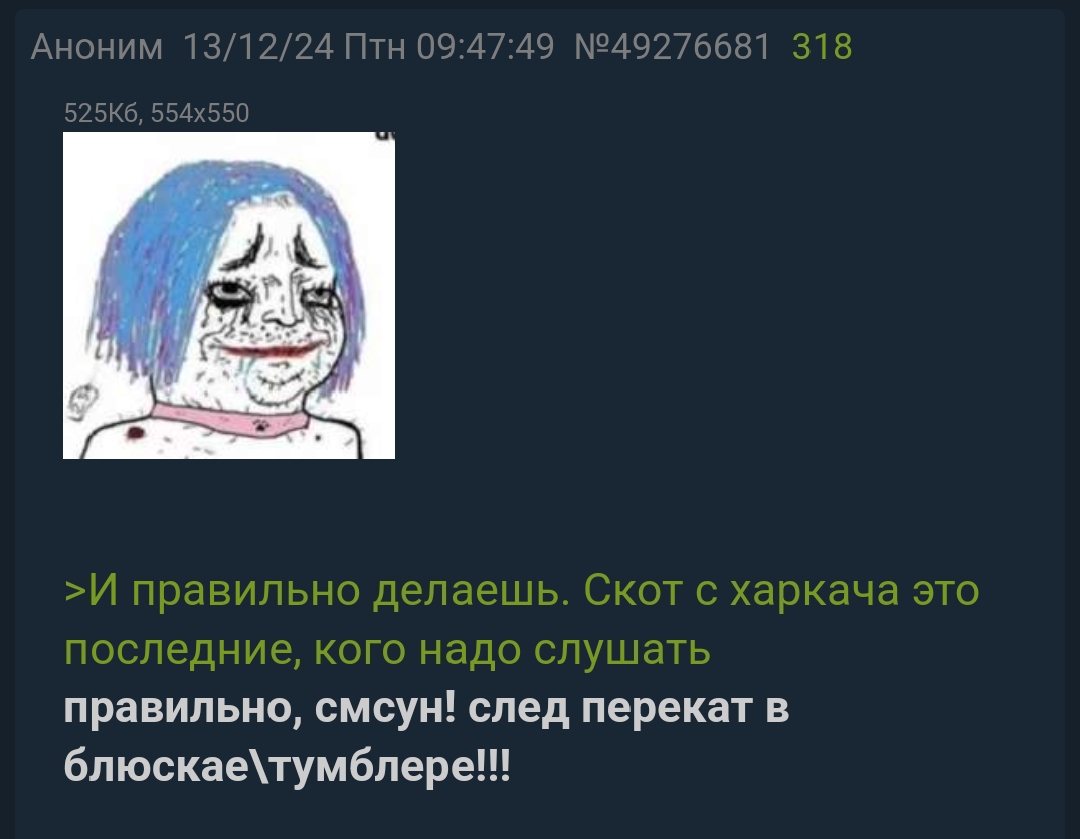 >>972082 мой коммент о том что Пенкин как бабка срака учащая всех как критиковать кому кого и как видео делать, при этом сам своим кукарекам не следует. Тоже самое с пынями (пик4), не нравится пенкчму - чего он мимо не проходит, по своей селючьей филасафии, как поучает стаса? Например обьясняю для тупого тебя: Пенкчмо говорит Срасу "нинравится нисматри пройди мима никритикуй", но сам мимо Сраса не прошел и критикует. Это не глупость это серьезный разрыв логического мышления, пенкин реально ментально болен. Тоже самое с пынями, не нравится пенкчму - чего он мимо не проходит, по своей селючьей филасафии, как поучает стаса?