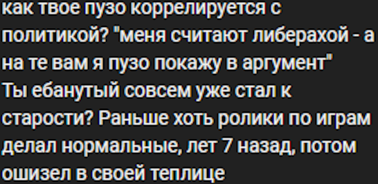 >>990785 (OP) Насколько я понял, периодически наблюдая за пациентом уже лет 8, он всегда рвался с условных дэтээфиров-пекарей, что увлечены играми больше, чем социалкой, и которые пишут об этом на разных площадках. Только чем отличается он, рассказывая как правильно жить и как неправильно? Тем что имеет мотик, плойку и может подтянуться на турнике больше 5 раз? Ну это весьма сомнительно для почти сорокета, чтоб хвастаться этим. И ведь у пенкина есть здравое звено, что надо становиться лучше, увлекаться чем-то, не портить жизнь другим, трогать траву и даже женские груди, но то, с какой желчью это подается, всё перекрывает. Я если захочу негатива, выйду на улицу посмотрю на серые сугробы из грязи и послушаю, как матерятся люди на кассе. Но не буду, мне этого и так хватает.