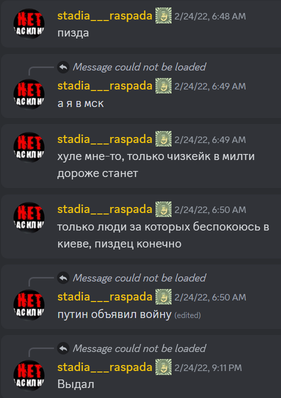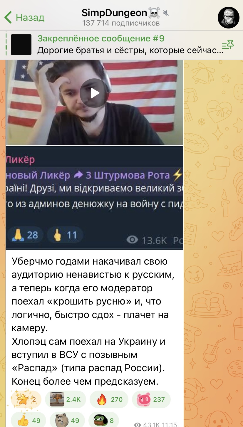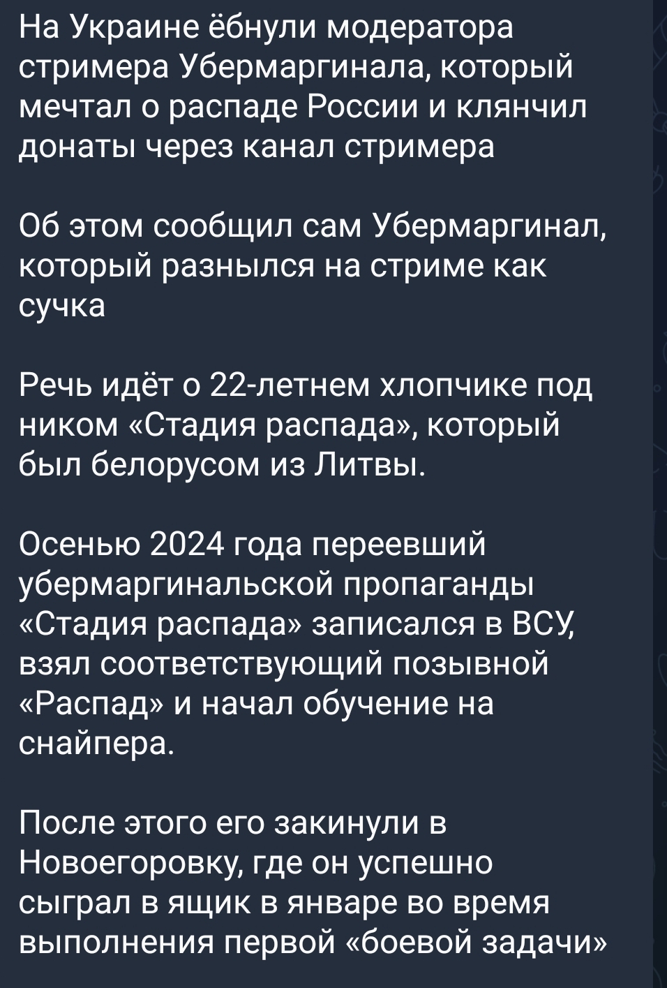 От "мне пох, я в мск. лишь бы чизкейк не подорожал" до отправки на фронт в один конец после беспрерывной промывки мозгов маргиналом, от которого тот был в полной эмоциональной зависимости (+30к постов тому подтверждение). Если бы мрагинал три года назад занял нейтралитет и вещал на старой волне, то это, во-первых, было бы честнее, т.к. он к этому конфликту НИКАКОГО отношения не имеет; а во-вторых этот Новак сегодня был бы жив и жрал бы в Москве свой слегка подорожавший чизкейк, продолжаяя донатить и постить в дискорде. Его смерть на совести Мрагинала.