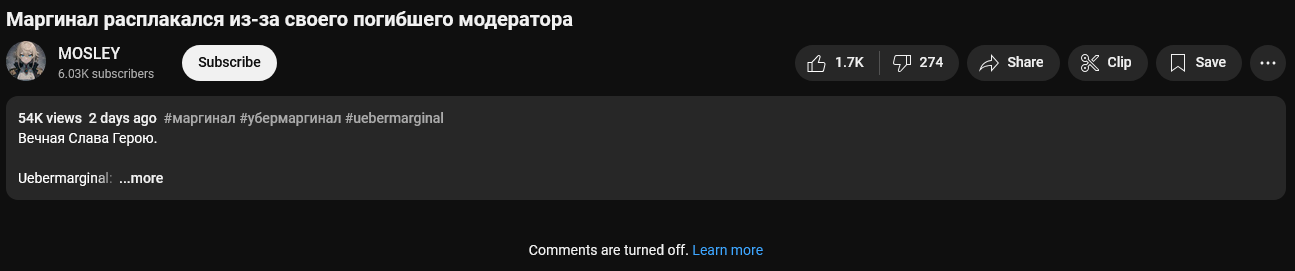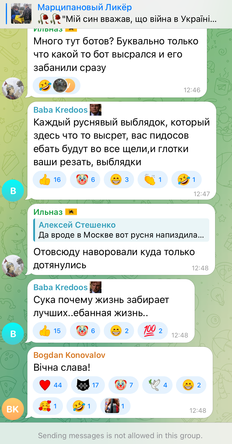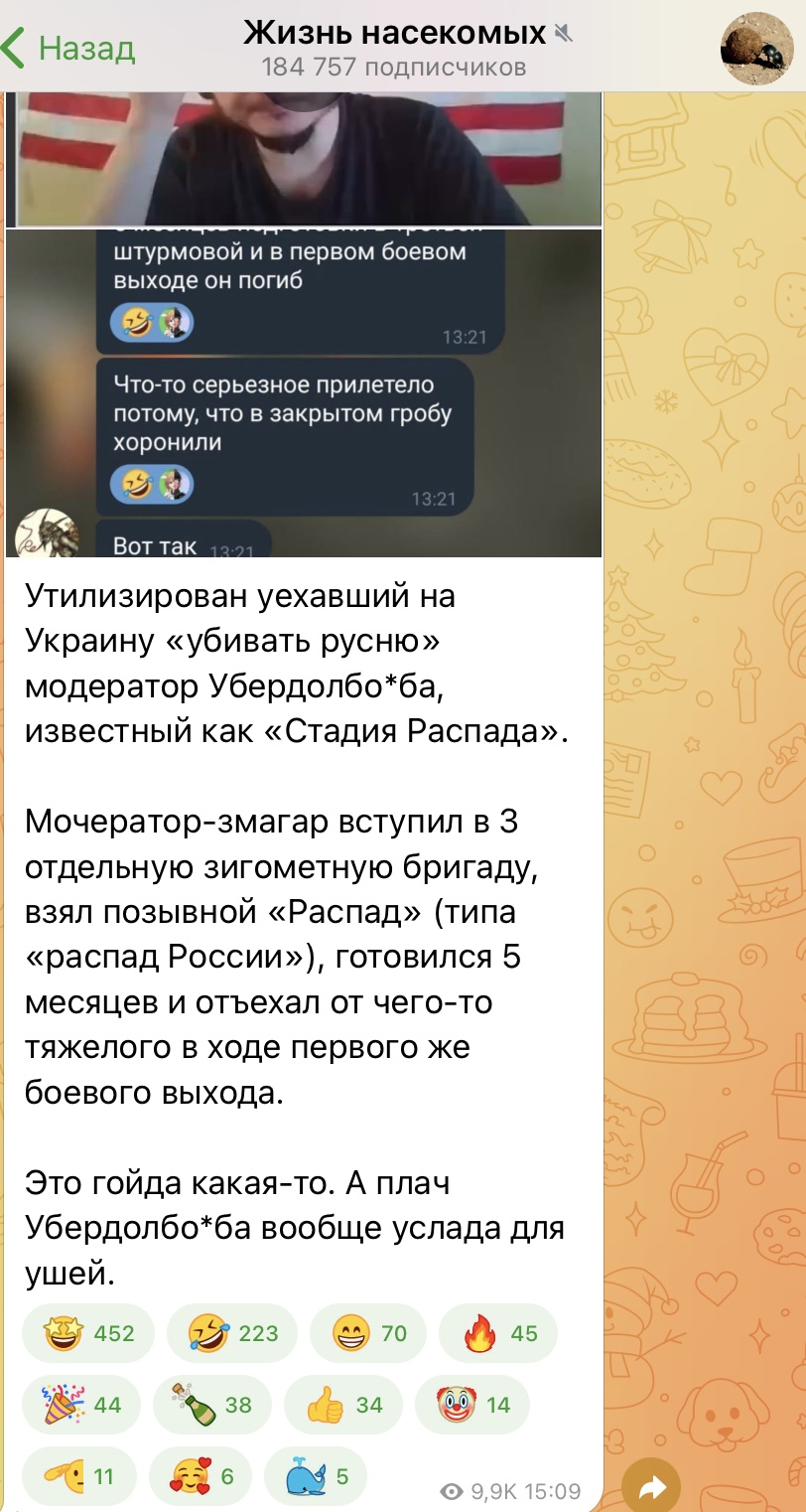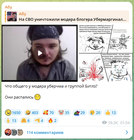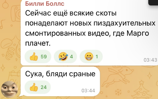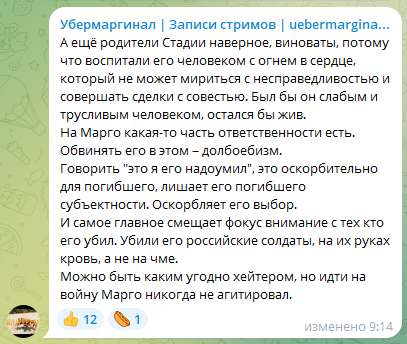 Раньше не понимал зетников, которые смеялись над плачущим марго в начале 22, но теперь, после всего, что этот выродок сделал, его реакция не вызывает ничего, кроме истеричного смеха. Я никогда не насмехался и не злорадствовал над смертью, не делаю так и сейчас, мой смех исключительно над Маргиналом, который насмехался буквально над тысячами смертей, включая стариков, женщин и детей.