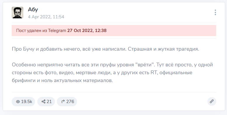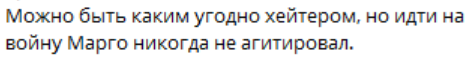 Кто скажет, мол, он напрямую никого не зазывал на фронт, допустим, "воюй микола" он не говорил, но он абсолютно точно говорил, что эта война представляет из себя намного большее, чем есть в реальности, последовательно строил культуру ненависти и негативно реагировал на любой намек на мирные переговоры.