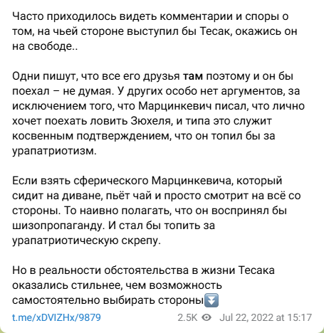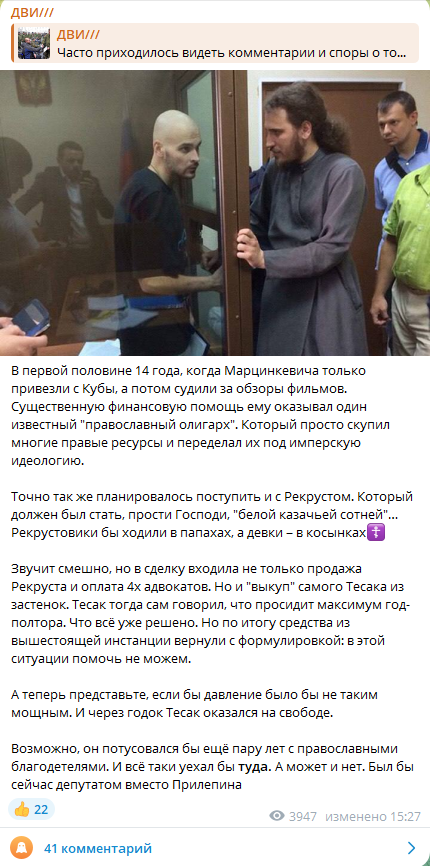 Про Тесака есть еще один интересный момент. Маргинал где-то говорил, что, по его мнению, Тесаку предлагали свободу в обмен на сотрудничество с поддержкой всего этого движа 2014 с Крымом, Русской весной и т.д., но тот послал всех на три буквы и отправился дальше идейно сидеть в СИЗО.