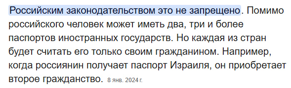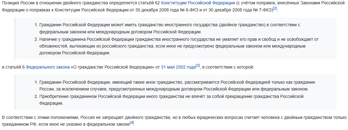 >>993212 > что значит РФ не признает двойное гражданство Если у тебя гражданство РФ и государства XXX, то при совершении преступления тебя будут судить как гражданина РФ. С полной отсидкой и всё такое прочее