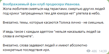 Согласен полностью, этот погибший бедолага админ вызывает только сочувствие, что не хватило своего ума и он поехал туда, куда не следовало. Особенно жалко его семью, которая вряд ли разделяла всю эту ебалу, раз отправили его учиться из РБ в РФ. Маргинал не знает и не понимает, что такое ответственность, он считает, что если живет в США на правах гражданина, то может срать в других местах, выебываться на кого хочет и ему за это ничего не будет. Все эти интернет злорадства над крокодильим нытьем ему до одного места, по большому счету, не первый год в интернете, переживет