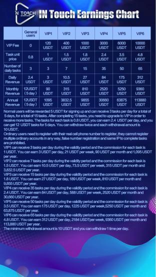 Есть свой русский чат в телеге https://t.me/INTouchMediaRUS7 где мне рассказали что первые 10USDT выводятся без ограничений Платят так много потомучто зарубежная компания и хочет реальных людей за накрутку