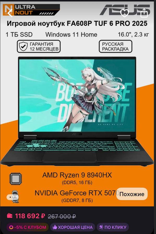 Топ с дискреткой: Tier1: Lenovo Legion 9/7/Pro / MSI Raider/Titan / HP Omen (HX) / Razer Blade / Acer Helios / Gigabyte Aero / ASUS Zephyrus/ROG/Flow/Scar / Alienware X/M / Clevo X / TongFang GM / - Топ-сегмент для любых задач до RTX5090, опциями до 4K 100%AdobeRGB 240Гц, батареями до 100Вт/ч, 1.6-2.5+кг веса и максимально возможным охлаждением. Tier1.1: Рабочие станции - Dell Precision / HP Zbook / Thinkpad P / Tier2: Lenovo Legion 5 Pro/Slim / Gigabyte Aorus / Dell G / Clevo P / Acer Helios Neo / Mechrevo 16 Pro / ASUS TUF 2025 / MSI Vector / Honor Magicbook Pro 16/ - оптимальный вариант по цене-перфомансу-всему остальному. Среднее качество, достаточное охлаждение, соотношение цена-качество. Tier3: Остальные бюджетки.