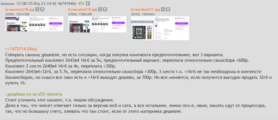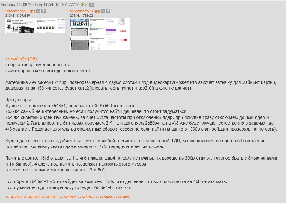 Топ-кража треда это сборка на 2011-3, с процессором 2643в4(дешевый аналог 1650в4) в виде готового комплекта с ВБ >>7472714 → или самосбор с ВБ+авито >>7474466 → . Альтернативные процессоры 2640в4 и 2637в4. Все, что ниже по сокетам для сборки с нуля просто не нужны, никакие 2011, 1150, 1155 и тем более 775. 1151 подходит меньше из-за пердолинга с биосами.