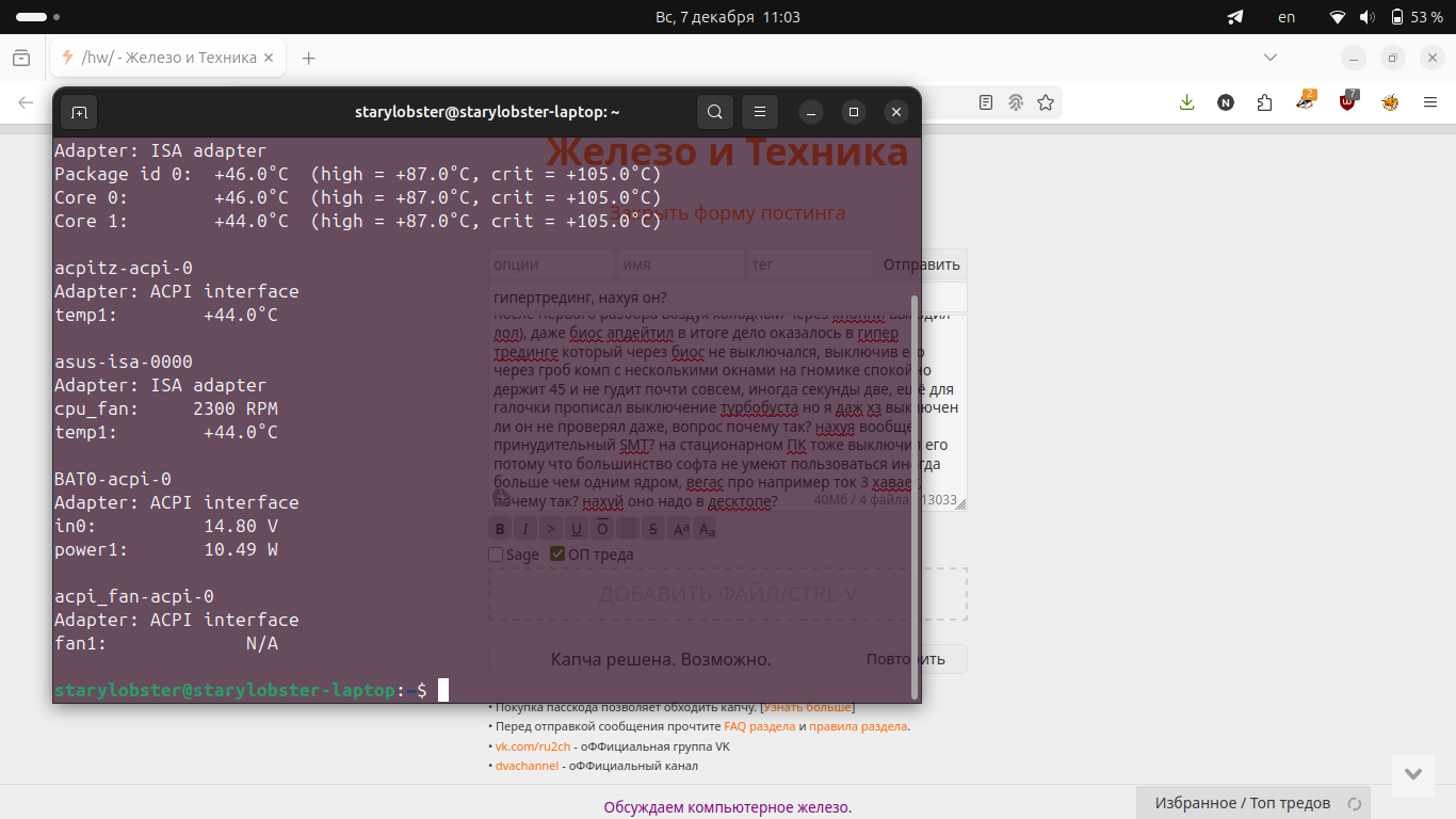есть кароч древнючий asus k56cm, по малу апгрейдил, термопасту менял, всё пылесосил, накатил мяту 21, оперативы 2 гб добавил батарею купил короче думаю полный фарш для текста и сёрфа вне дома, может ещё чего по мелочи, да вот только постоянно стучал в 50-55 градусов в простое, оттого кулёк постоянно гудел, даже чистый дебиан накатил как то по рофлану когда диск менял а он даже там гудит, короче колхозил охлад как мог, делал манипуляции с клавиатурой и скотчем (менял клаву и после первого разбора воздух холодный через кнопни выходил лол), даже биос апдейтил в итоге дело оказалось в гипер трединге который через биос не выключался, выключив его через гроб комп с несколькими окнами на гномике спокойно держит 45 и не гудит почти совсем, иногда секунды две, ещё для галочки прописал выключение турбобуста но я даж хз выключен ли он не проверял даже, вопрос почему так? нахуя вообще принудительный SMT? на стационарном ПК тоже выключил его потому что большинство софта не умеют пользоваться иногда больше чем одним ядром, вегас про например ток 3 хавает, почему так? нахуй оно надо в десктопе?