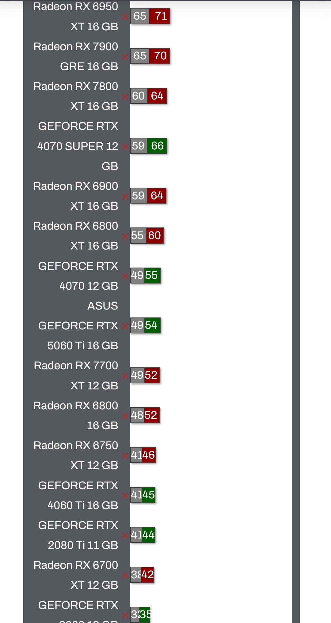 5090 - провальная карта, не может выдать даже 30 фпс в игре 2007 года (Mafia 2) или Mirror's Egde 2009 5080 - провальная карта, уровень 4080ы двухлетней давности, но в 1,5 раза дороже 5070ti - провальная карта, не дотягивает даже до простой 4080 4090 - провальная карта, не может выдать даже 60 честных фпс. 4080 - провальная карта, для дурачков которые зачем-то заплатили 100к, но не нашли чуть денег доложить для 4090 4070ти - провальная карта, всего 12гб в 2023 4070 - провальная карта, сосет у 4070ти не разгибаясь и всего на 200 баксов дешевле 4060 - провальная карта, сосет у 3060ти если куртка не занес студии за фреймген. 3090ти - провальная карта, печка за 2к баксов сосущая у 4070ти 3090 - провальная карта, горячая тыква с 24гб. 3080ти - провальная карта, горячая, всего 12гб, тыква-версия 4070 3080 - провальная карта, тыква-печка 10гб 3070ти - провальная карта, тыква-печка 8гб 3070 - провальная карта, даже в дуракхд уже не очень, 8гб ахаха 3060ти - провальная карта, даже в дуракхд так себе, 8гб ахаха 3060 - провальная карта, затычка для нейросеток 3050 - вы серьезно? тютюри - если вам бесплатно дали... паскали от 1060 и выше - норм ютуб глядеть. амд - тут зеленый тред интел - встроечка штоли? 1050ти - вечный вин.