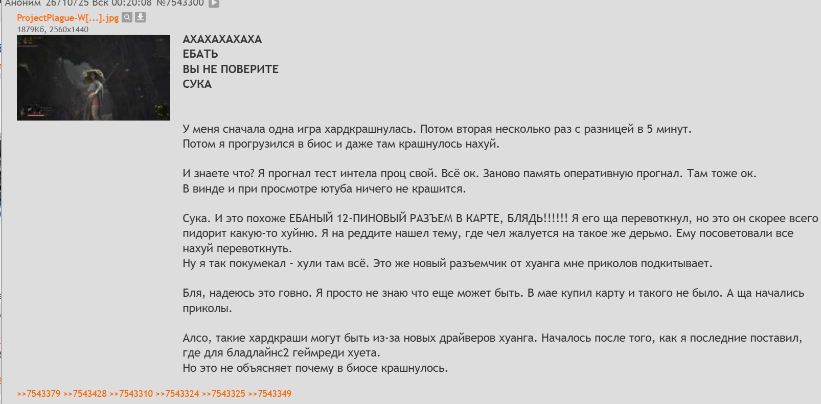 >>7543524 Еще что странно: Первый раз бсоднуло в wukong с характерным бррррр из динамиков и черным экраном с пищалкой материнки, что система ребутится. "Странно", подумал я. И продолжил играть. Больше такого не было.