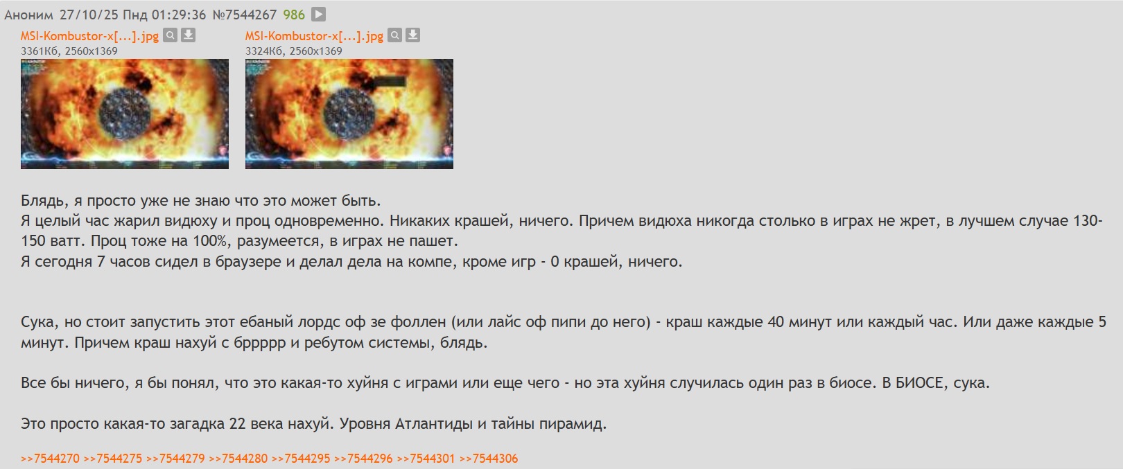 У меня сначала одна игра хардкрашнулась. Потом вторая несколько раз с разницей в 5 минут. Потом я прогрузился в биос и даже там крашнулось нахуй.