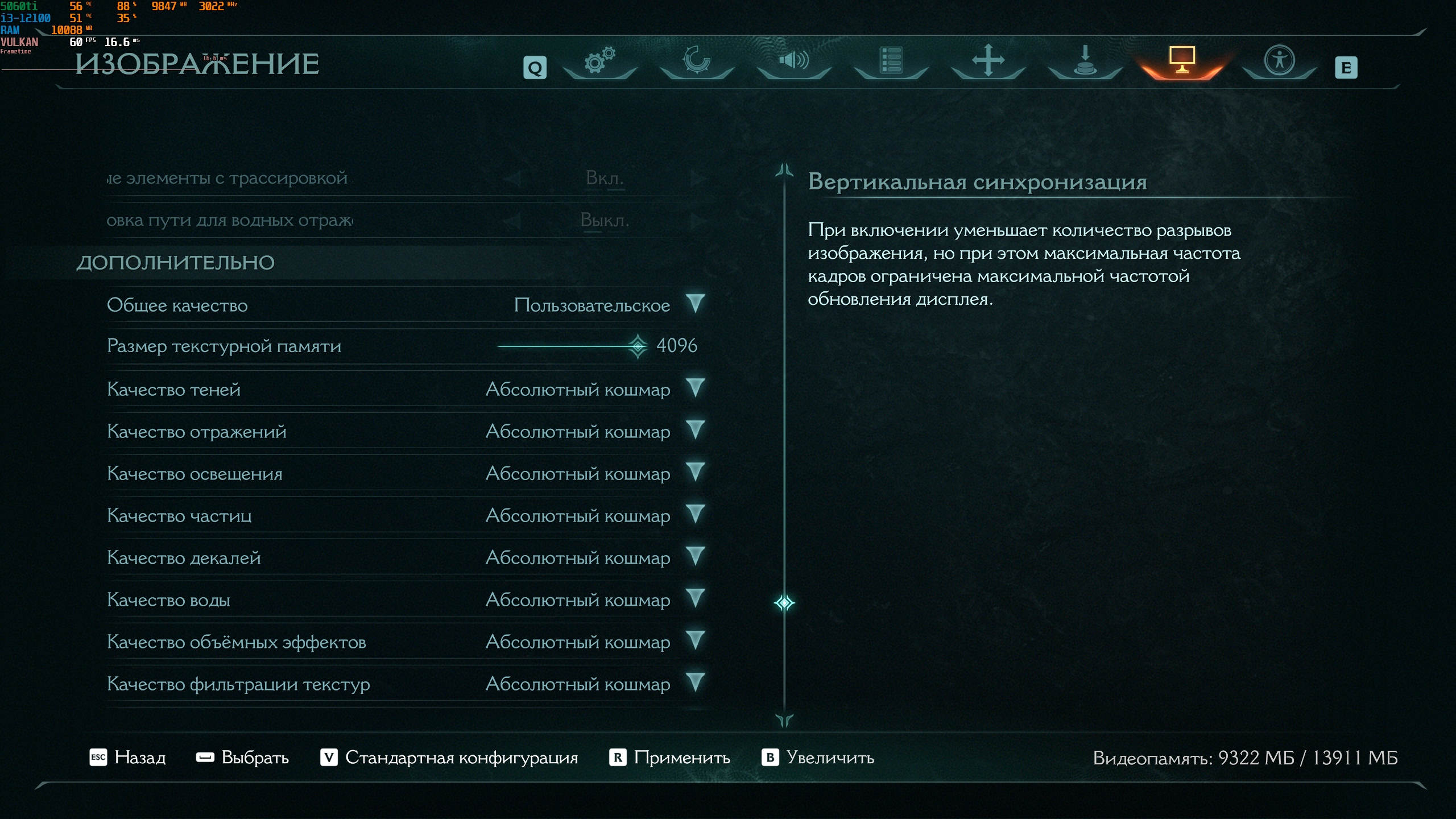 >>7547221 Подрубаем длсс на пресет качества и видим как карточка ведёт себя в ситуации когда не упирается в видеопамять. Зная сколько примерно добавляет производительности длсс в пресете качества относительно натива можно посчитать сколько фпс должно быть в нативе, если бы карта не захлебнулась от недостатка видеопамяти (примерно 9-10 фпс). Та же сцена, то же самое время, тот же самый сейв, потребление рамы упало до 11гб, так сколько видеопамяти нам не хватает в игре 2020 года с длс выпущенным в 2023 году? 4к было представлен в 2012 году и стало дешеветь спустя три года. Сейчас 4к моник может себе позволить любой бомж (если это конечно не олед 32" 120гц). Кто виноват в том что не хватает 16гб видеопамяти? Кибербаг? 4к? Куртка? А может 16гб хватает потому что никто не будет играть в 4к в нативе и как минимум поставит длсс на качество?