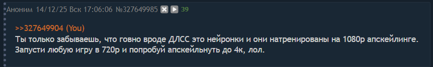 Ну типа: "на 480п я буду иметь дохуя нативного фепеса, а вы промытые гои вас наебали на бабло вашими фулхеде мониторами, а длаа в 480п выглядит не хуже вашего сраного длсс с фреймгеном в 1080п, у вас от него в 1080п задержки лолкек промытки"